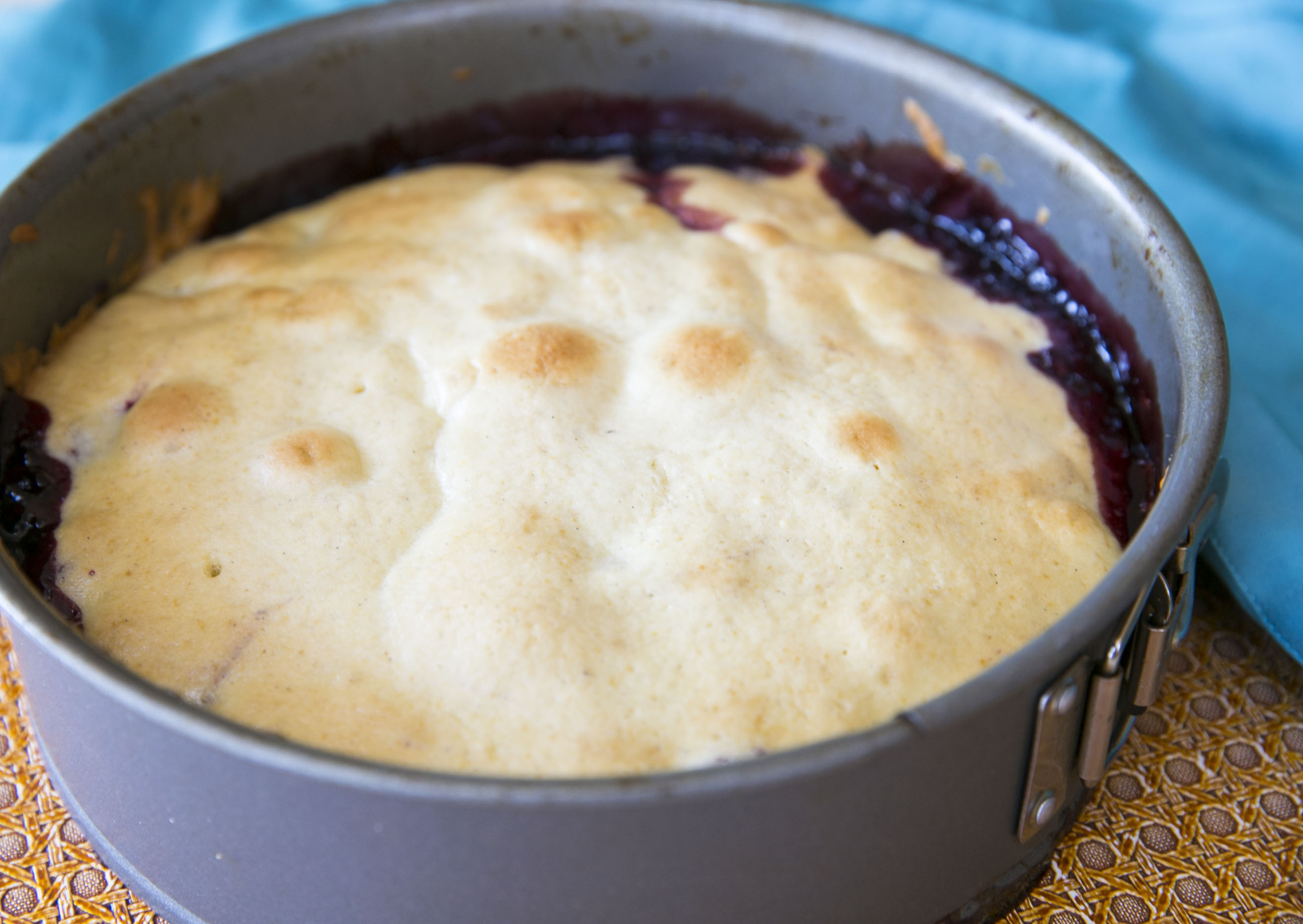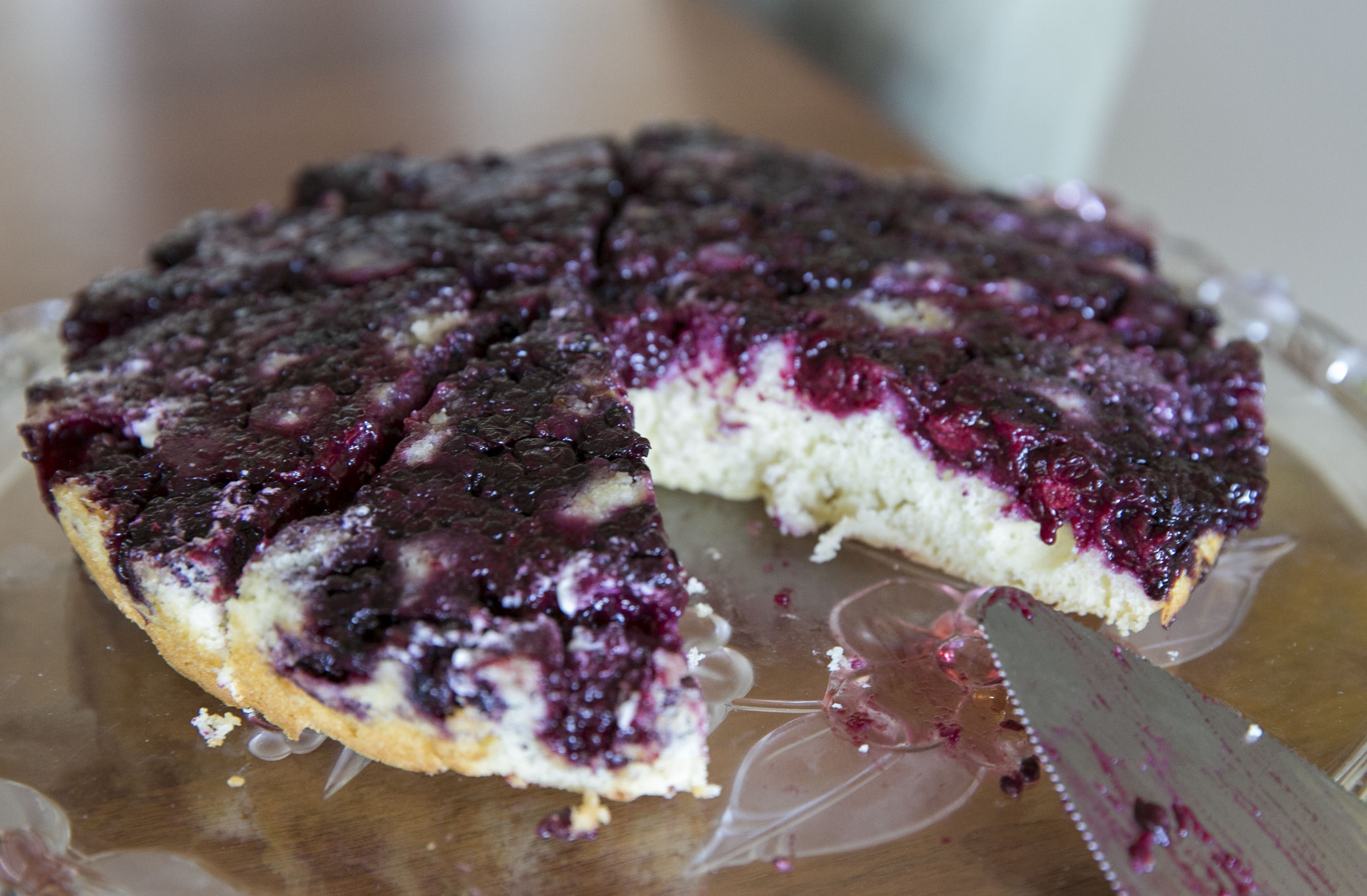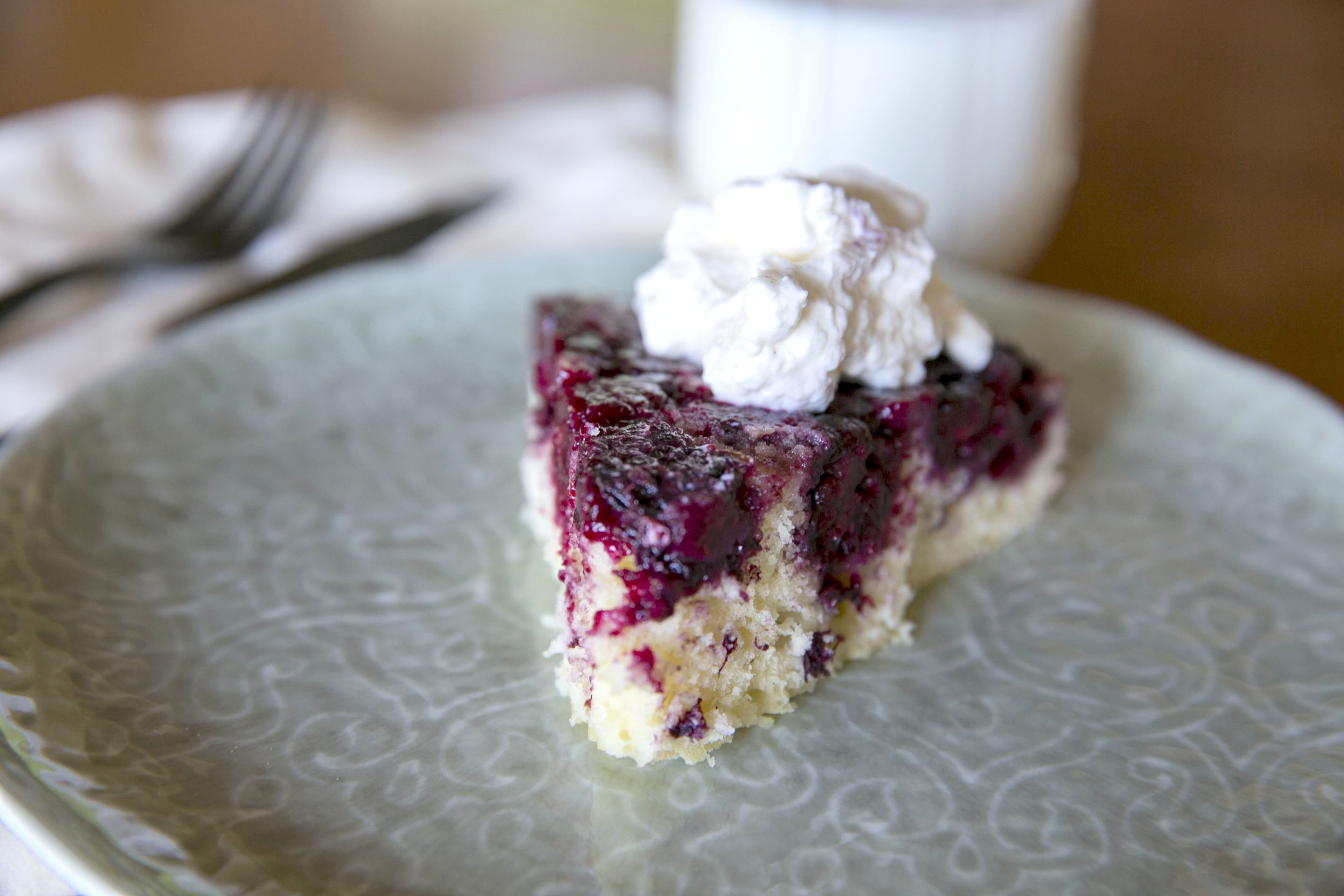 Bake at 350 degrees for 40 minutes or until done. Insert a wooden toothpick in the center to see if it comes out clean. Cool in pan for 10 minutes. Loosen edges of cake with a knife. Place a plate upside down on top of cake pan and flip over so the bottom of the pan is on top. Slowly loosen cake as you retract the sides. Then, slowly remove the top of the pan easing the berries off gently with a knife.